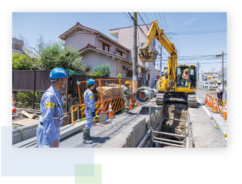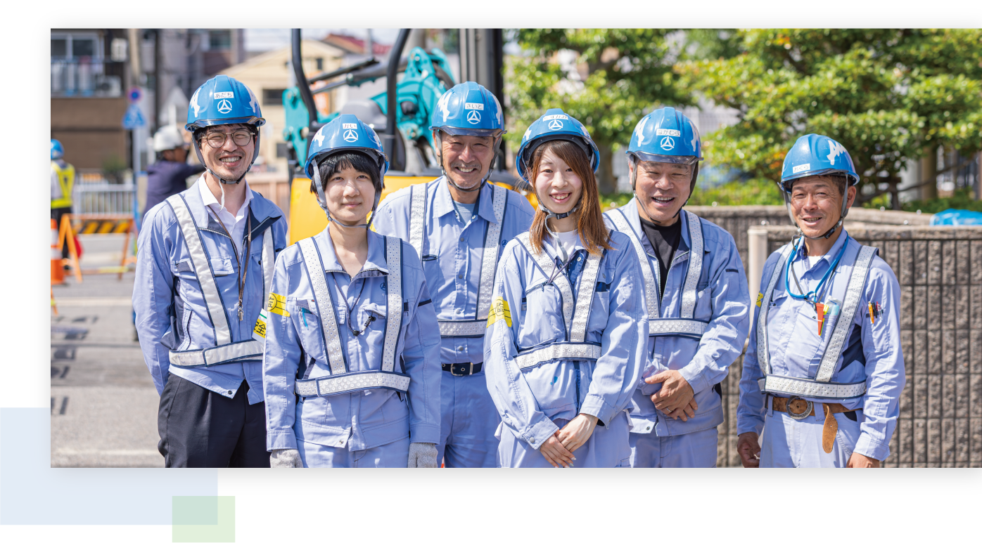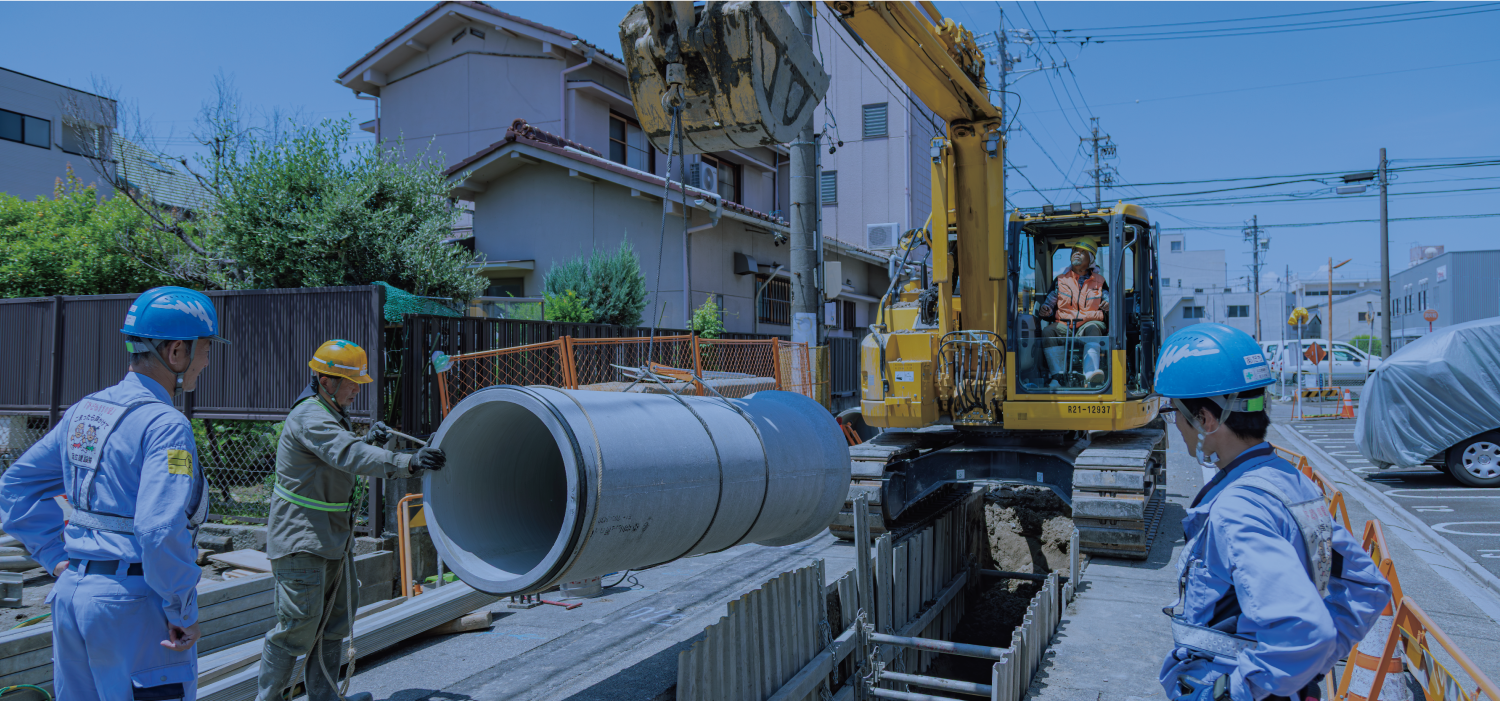 「道路舗装工事」「上下水道工事」「一般土木工事」を事業の三本柱としています。いずれも、私たちの暮らしに欠かせない、都市の重要なライフラインです。そうした土木工事の専業会社として、直営班を持たず、現場管理に特化していることが当社の大きな特徴です。