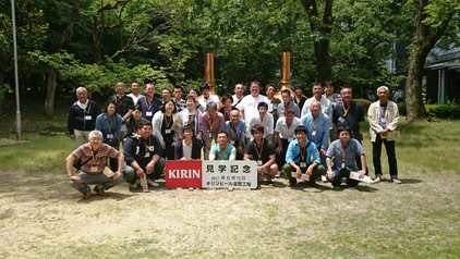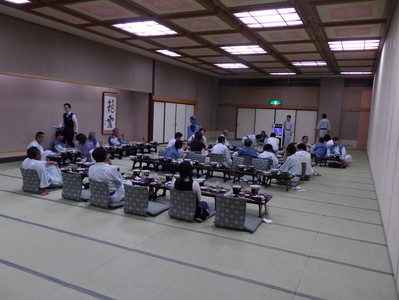 会場は、熱田区 賀城園 という料亭でした。 送迎バスのお迎えで着いた賀城園の玄関は、作業服の 私たちには場違いなほど落ち着いた雰囲気でしたが、 4階(屋上)のビヤガーデンに着くと、作業服がお 似合いなスペースとなっていて、ホッとしました。